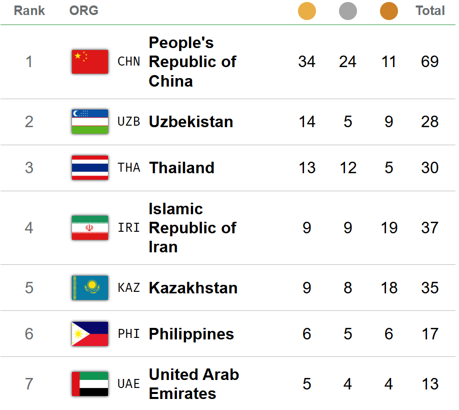 Всего в Играх участвуют около 8000 атлетов из 45 национальных олимпийских комитетов. Казахстан завоевал девять золотых, восемь серебряных и 18 бронзовых медалей и расположился на пятом месте в общем зачете.