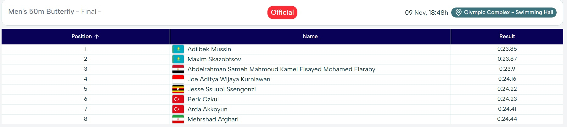 Казахстанцы Адилбек Мусин - чемпион на 50 метрах баттерфляем, а Максим Сказобцов - вторым