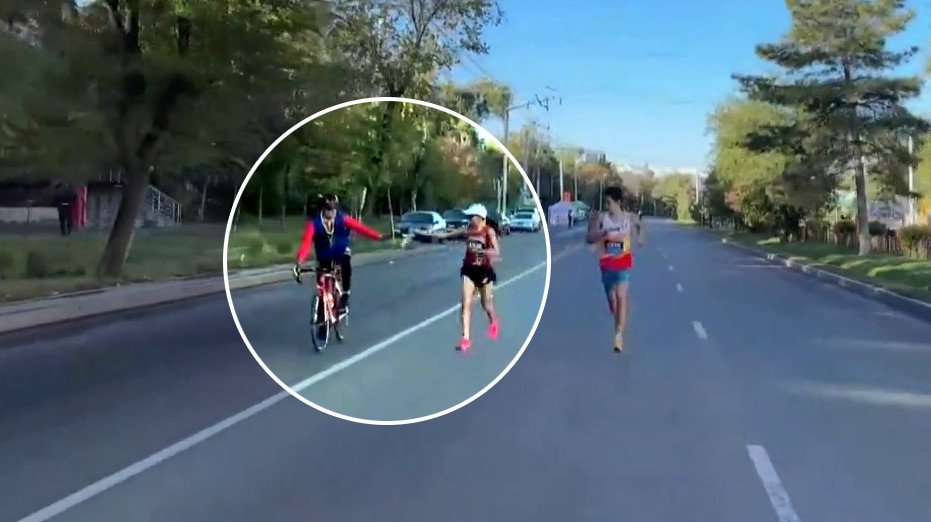 Оказалось, что спортсменка из Кыргызстана во время бега несколько раз взяла воду у маршала, который сопровождал лидеров женской дистанции на велосипеде. Один из таких моментов попал на видео во время трансляции. Такие маршалы на велосипедах сопровождали лидеров среди мужчин и женщин на разных дистанциях.
