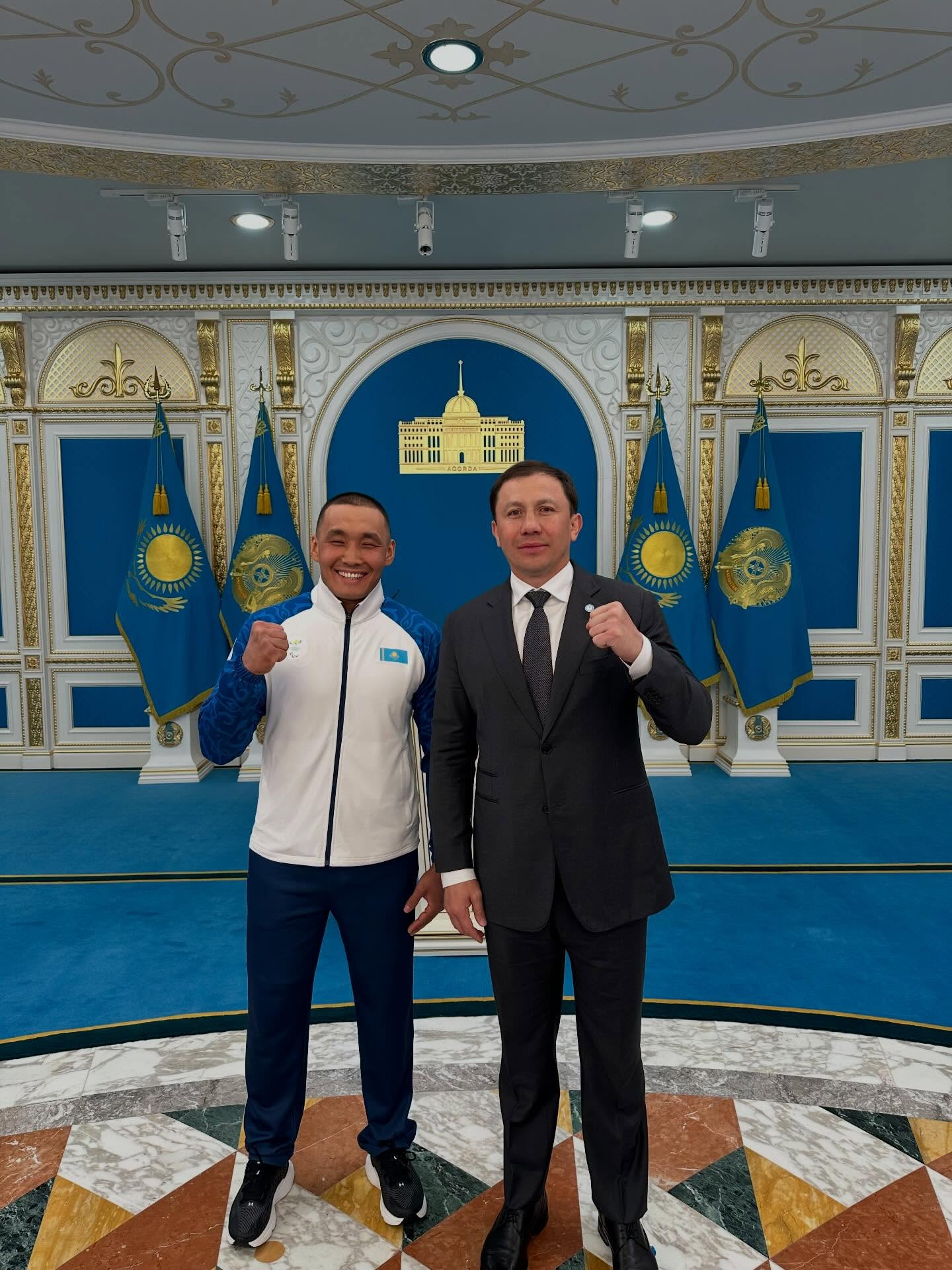 Хамитов после церемонии получения флага в Ак Орде от Касым-Жомарта Токаева поделился фотографией с президентом Национального олимпийского комитета Геннадием Головкиным.