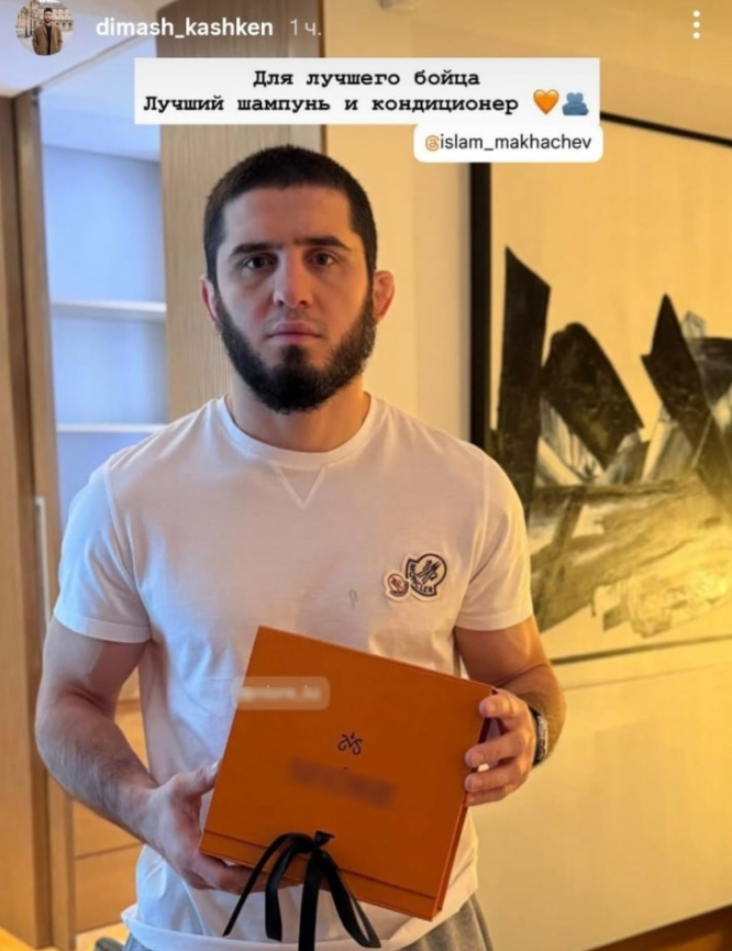 Махачев выложил у себя в Stories видео, в котором показал продукцию, которую распространяет супруга Димаша - блогер Мерей Абилова. Позже это же видео опубликовал Кашкен, который добавил ещё и фото Махачева с полученным презентом: