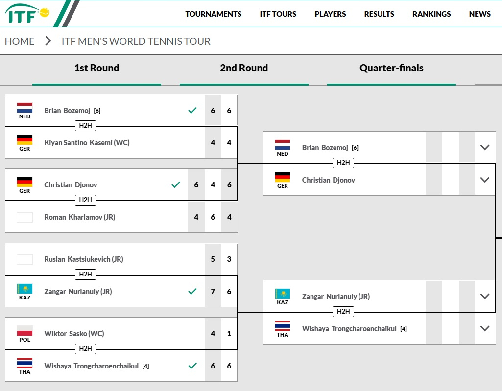 17-летний казахстанец выиграл стартовый матч на турнире ITF (Международная федерация тенниса) в Египте. В первом круге основной сетки Зангар Нурланулы обыграл 18-летнего белорусского теннисиста Руслана Кацукевича со счетом 7:5, 6:3.