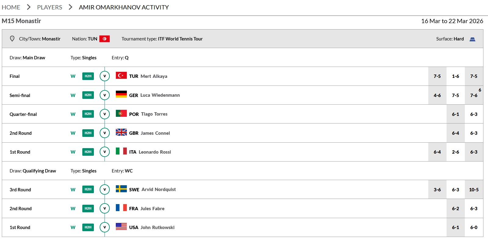Это второй титул Омарханова в одиночном разряде на взрослом уровне – в ноябре 2025 он выиграл аналогичный турнир ITF M15 в Тунисе.