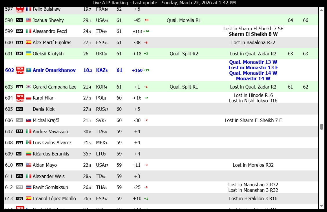 Омарханов перешел из юниорского во взрослый тур в 2025-м году. В понедельник он поднимется на рекордно высокое 602-е место в рейтинге АТР.
