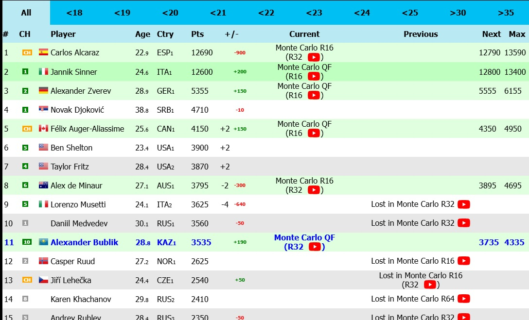 Бублик не защищает рейтинговые очки в Монте-Карло, годом ранее казахстанец проиграл в первом круге квалификации. Выход в четвертьфинал Мастерса – исторический результат для Бублика, ранее он не заходил так далеко на турнире.