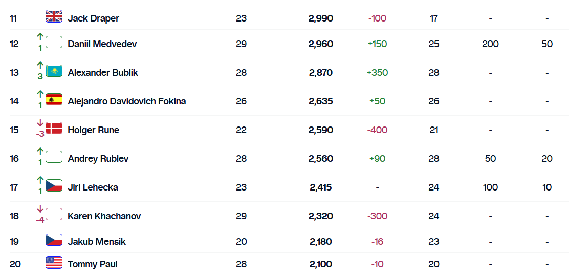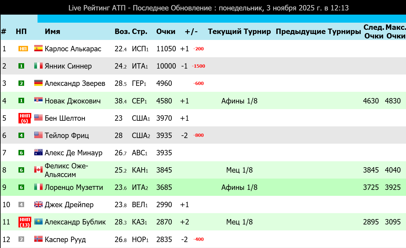 Лидирует в списке итальянец Янник Синнер. Он сместил на вторую строчку испанца Карлоса Алькараса. Тройку лидеров замыкает Александр Зверев из Германии.