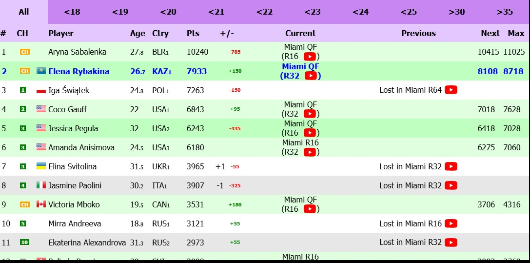 В Майами Рыбакина не защищает рейтинговые очки, а Соболенко защищает 1000 очков за прошлогодний титул.