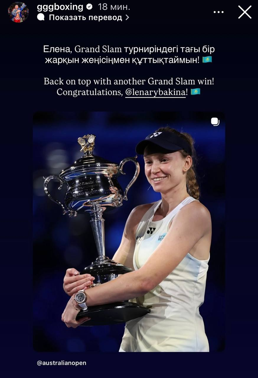 Легендарный казахстанский боксёр Геннадий Головкин поздравил Елену Рыбакину с триумфом на Australian Open-2026, сообщает Спорт Шредингера.