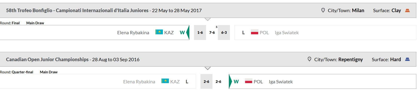 История матчей Рыбакиной и Швентек началась десять лет назад – еще по юниорам. Первый матч в истории остался за полькой, а в 2017-м девушки встретились в финале престижного турнира в Италии, где Рыбакина взяла реванш.