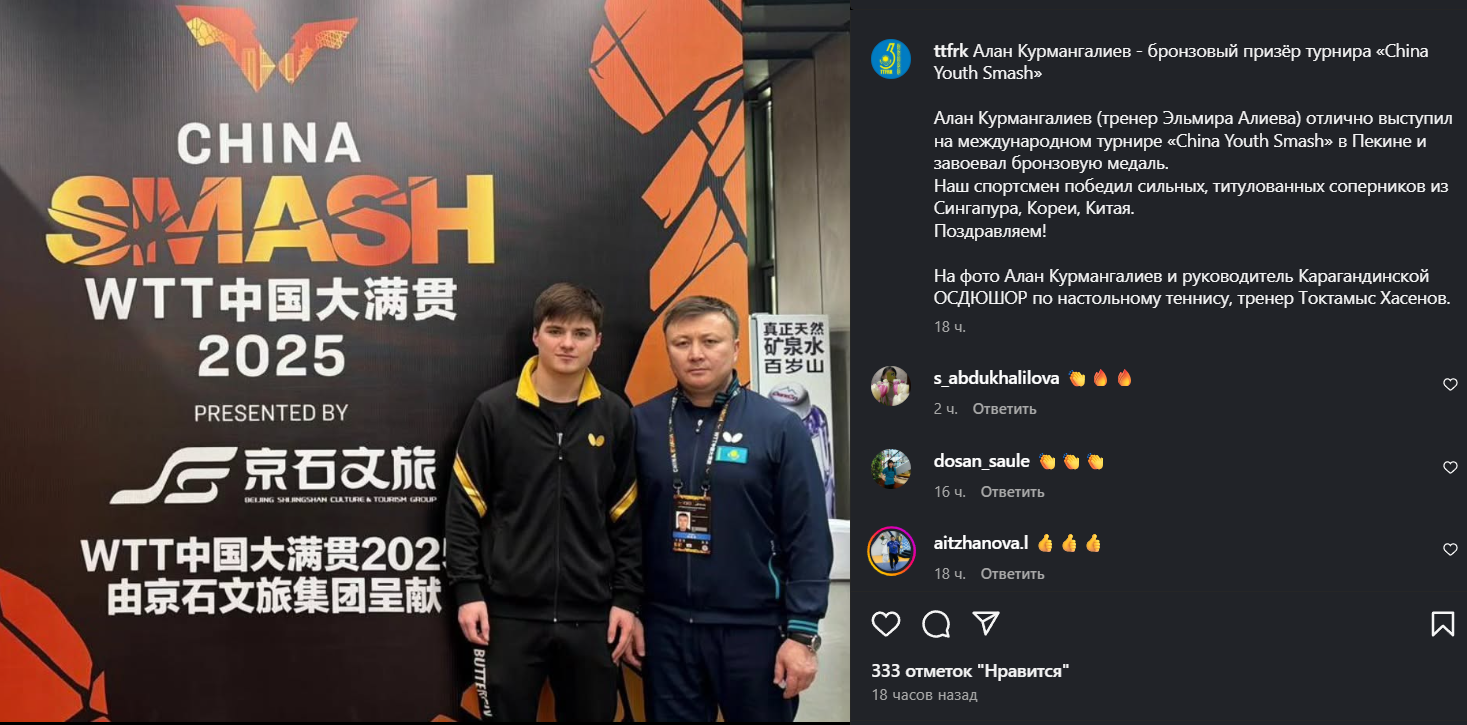 Казахстанец Алан Курмангалиев завоевал бронзовую медаль на турнире по настольному теннису China Youth Smash в Пекине, сообщает Спорт Шредингера.