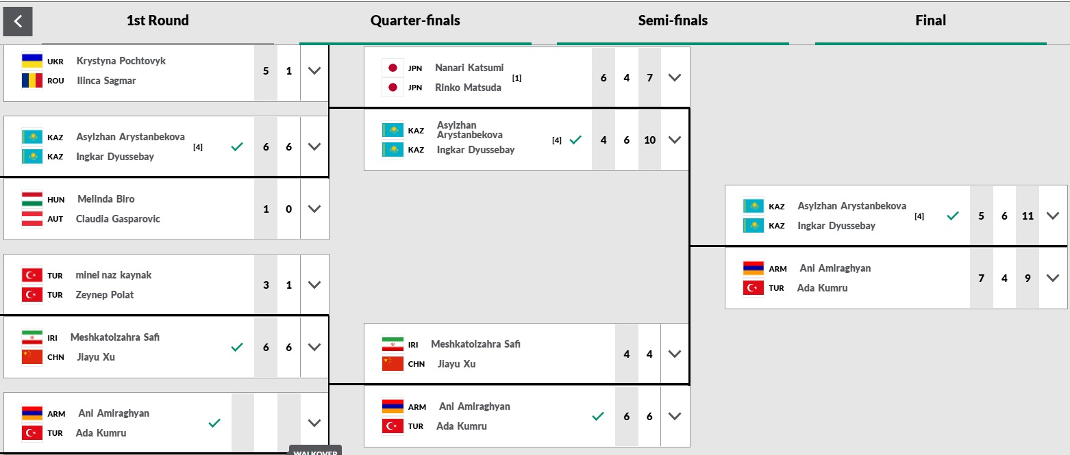 В финальном матче турнира ITF W15 в Анталье казахстанские теннисистки обыграли армянско-турецкий дуэт Ани Амирагян / Ада Кумру - 5:7, 6:4, 11:9.