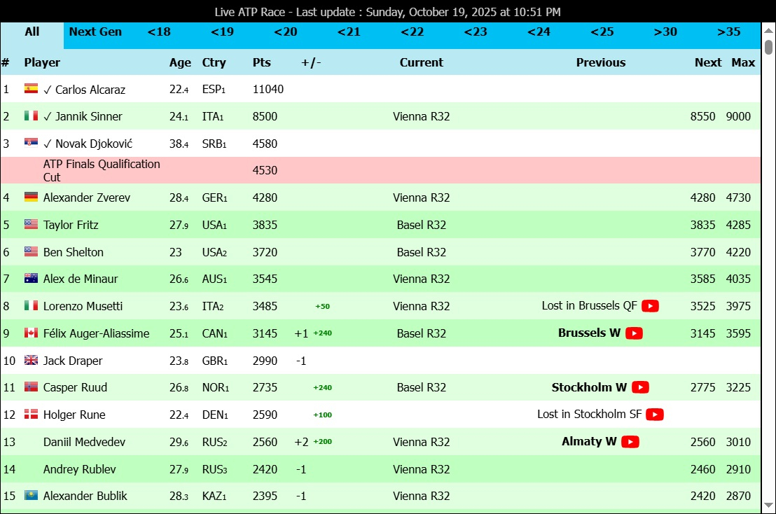 В гонке также и казахстанец Александр Бублик. После травмы, полученной в Кубке Дэвиса против Кореи, Бублик провалил Мастерс в Шанхае, а затем снялся из Алматы. На этой неделе казахстанец заявлен на АТР 500 в Вене, как и Медведев.