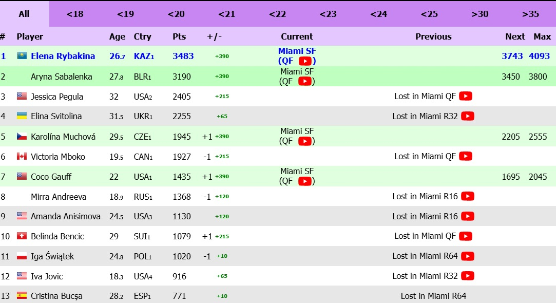 На турнире в Майами Рыбакина и Соболенко сыграют в полуфинале, так как на момент жеребьевки казахстанка занимала третье место в рейтинге WTA и попала в сетку Соболенко. Турнир в Майами Рыбакина начала уже в статусе второй ракетки планеты.