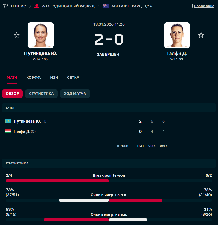 Казахстанская теннисистка Юлия Путинцева одержала победу в матче первого круга турнира WTA 500 в Аделаиде (Австралия), сообщает Спорт Шредингера.