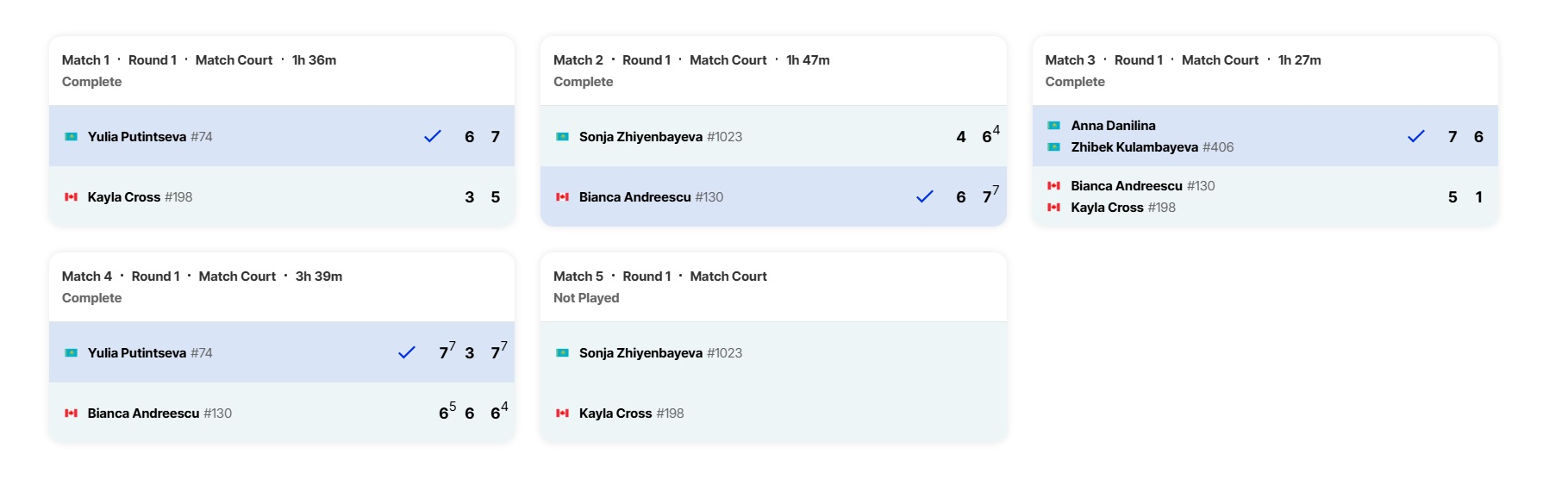 - Анна Данилина / Жибек Куламбаева – Бьянка Андрееску / Кайла Кросс – 7:5, 6:1