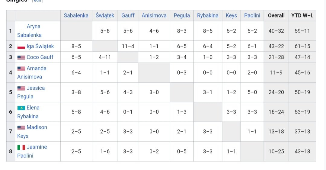 Ниже таблица личных встреч всех участник WTA Finals, а также баланс матчей сезона. Рыбакина сыграла 72 матча в этом сезоне (без учета игр за сборную Казахстана), это второй результат в туре после Иги Швентек (76 игр). Меньше всего времени на корте провела Мэдисон Киз - 50 матчей.