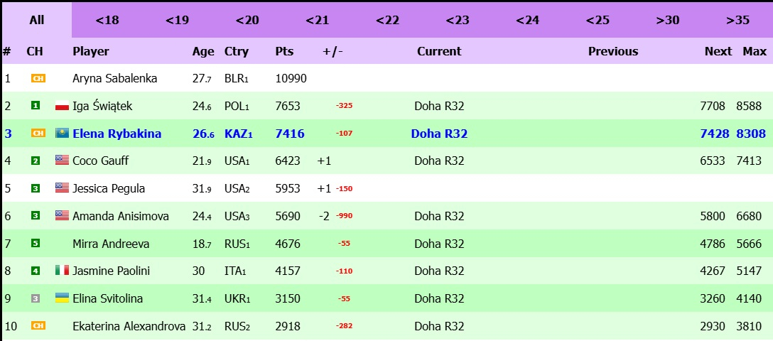В Дохе и Рыбакина, и Швентек защищают рейтинговые очки за прошлогоднее выступление. В 2025-м Рыбакина проиграла Швентек в четвертьфинале и теперь защищает 215 очков. Ига в следующем раунде оказалась выбита Еленой Остапенко из Латвии – 390 очков. Обе спортсменки за счет высокого рейтинга начнут борьбу со второго круга и уже получили по 65 очков.