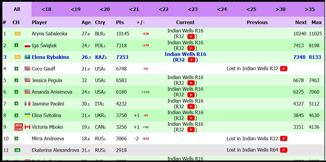 Live-рейтинг WTA