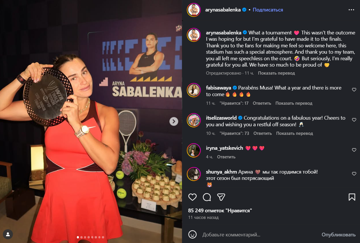 Что за турнир. Это не тот результат, на который я надеялась, но я рада, что дошла до финала. Спасибо болельщикам за то, что они позволили мне почувствовать себя здесь желанным гостем, на этом стадионе такая особенная атмосфера. И спасибо моей команде, вы все лишили меня дара речи на корте. А если серьёзно, я действительно благодарна вам всем. Нам есть чем гордиться, - написала Соболенко на своей странице в социальных сетях.