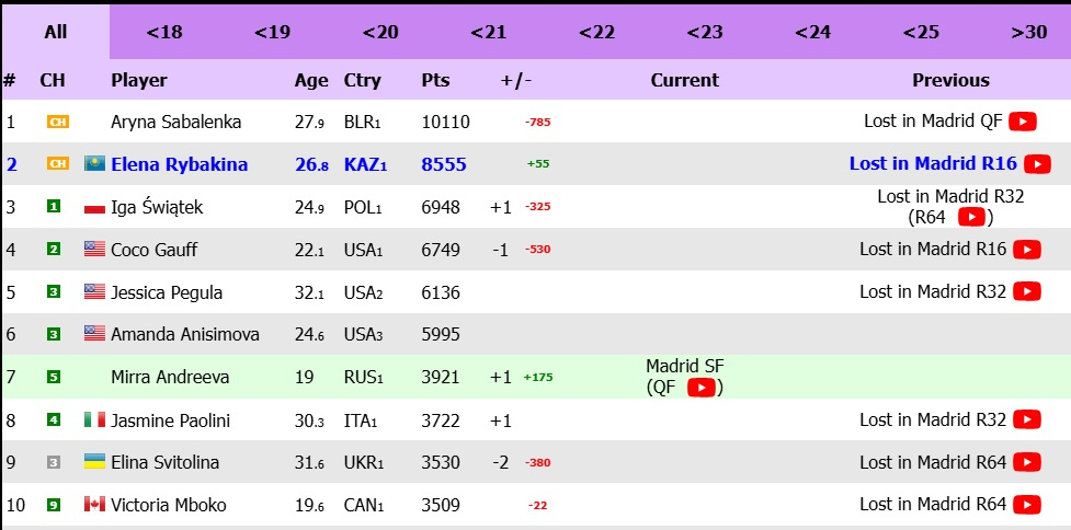 При самых оптимистичных раскладах Елена Рыбакина может догнать Арину Соболенко в рейтинге уже в ходе Ролан Гаррос, где разыгрывается 2 тысячи очков.