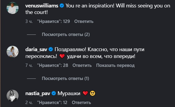 Под постом казахстанской теннисистки большое количество комментариев. В их числе сообщения от экс-первой ракетки мира Винус Уильямс, а также австралийки Дарьи Савилл и россиянки Анастасии Павлюченковой.