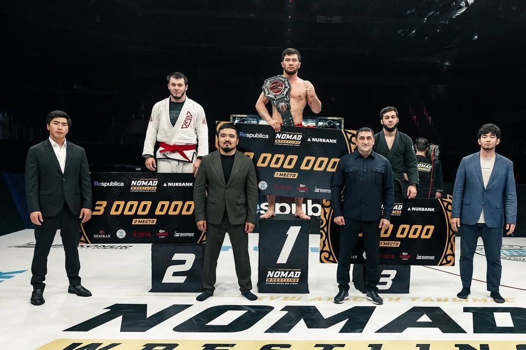 Таким образом, Азамат Бакытов стал обладателем чемпионского пояса Nomad Wrestling и сертификата на 10 000 000 тенге.