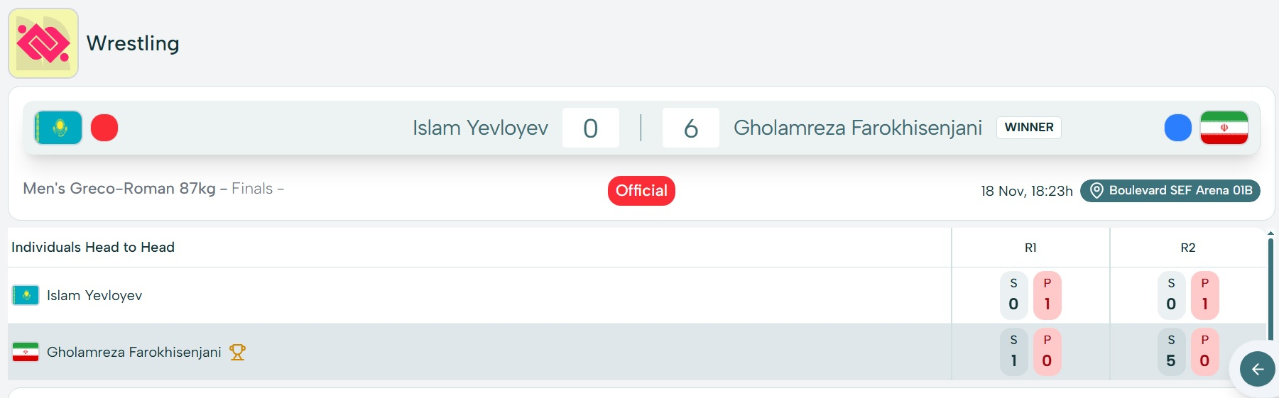 В Эр-Рияде борец греко-римского стиля Ислам Евлоев дошел до финала в весовой категории до 87 килограммов. В схватке за золото кзахастанец уступил Голамрезе Фарохи из Ирана - 0:6.