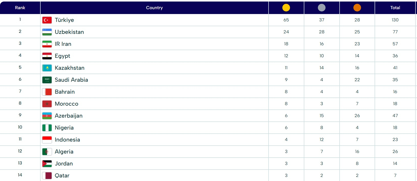 Теперь у Казахстана 41 медаль - 11 золотых, 14 серебряных и 16 бронзовых. В общекомандном зачете Казахстан располагается на пятой позиции. Лидируют Турция и Узбекистан. Игры Исламской солидарности продлятся до 21 ноября.
