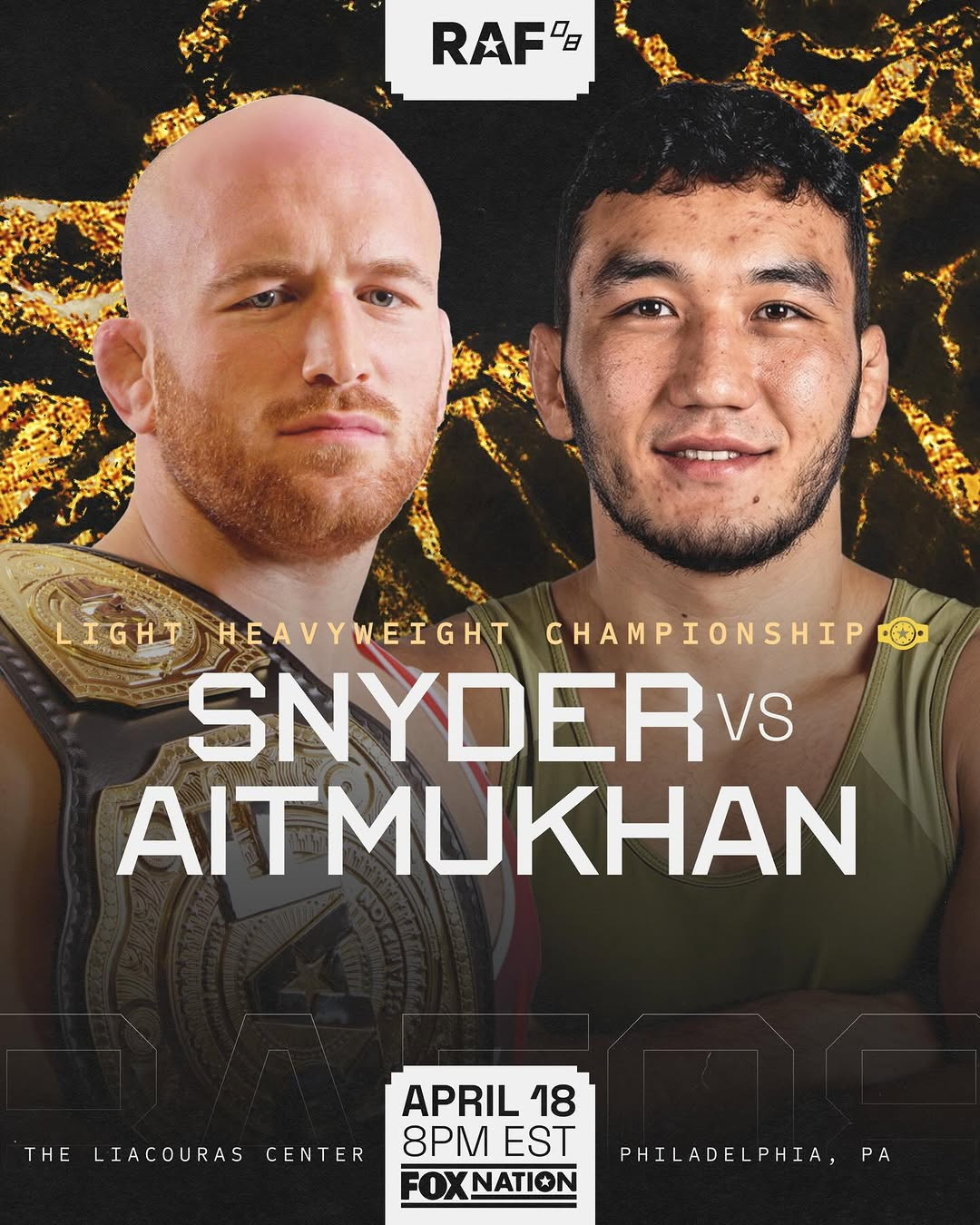 Поединок состоится 18 апреля в Филадельфия в рамках турнира RAF 08. На кону будет стоять чемпионский пояс лиги RAF в полутяжелом весе, которым владеет Снайдер.