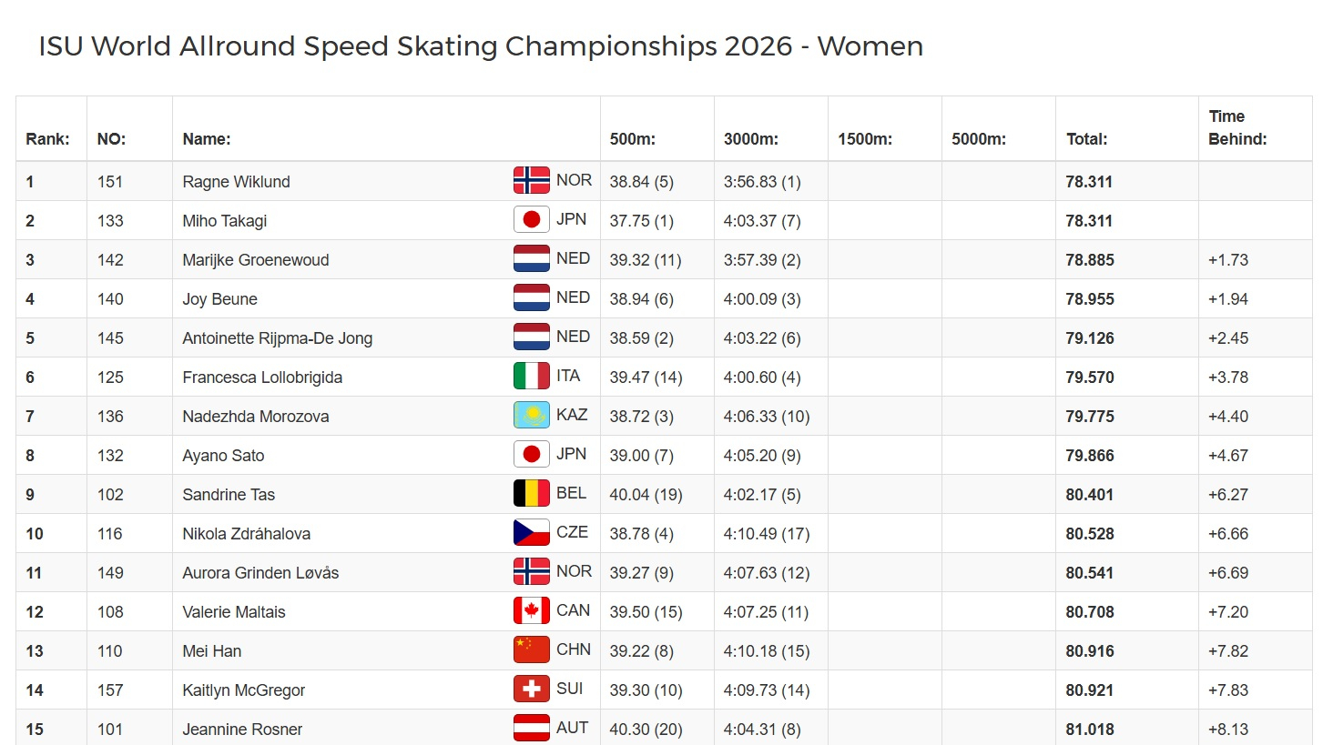 По сумме двух дистанций (500 и 3000) казахстанка занимает седьмое место. Тройка лидеров после двух стартов: